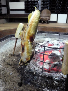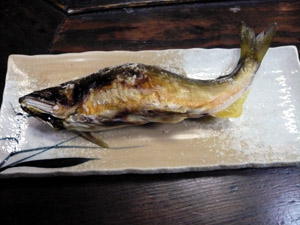 鮎(あゆ)は、シーズンに近くでとれた天然物を、冷凍しておいたものだそうで、まったく臭みもなく結構でした。