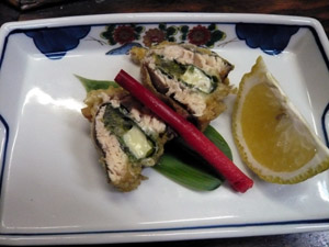 ・虹鱒でシソとチーズ、蕗味噌を挟んでのフライ。 これも、結構でした。しかし、山の幸、川の幸、ありがたい、ありがたい。