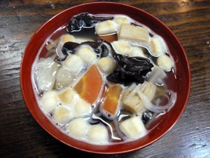 お澄ましの吸い物で、糸こんにゃく、ホタテ、麩(おふ)、キクラゲ、サトイモにニンジンなどが入っています。