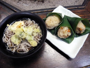 この日の「そば」は、天ぷらそば。天ぷらは「赤かぼちゃ(甘い)と、こごみ」。