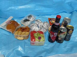 弁当持参。この緑地近くにスーパーがあったので、飲み物(キャンティ&ビール)のほか、チーズやコロッケなどかいました。